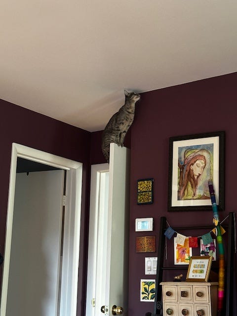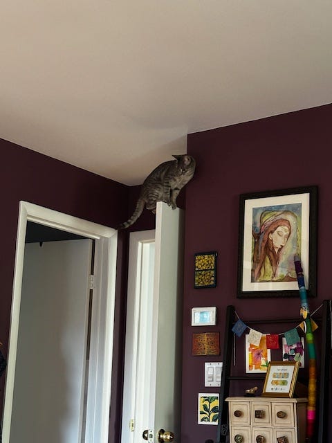 Our new kitty is certified bonkers, and we love it. The latest quirks we’ve discovered are that she can (and will) leap onto the tops of doors, and she likes to play fetch with a very particular type of toy mouse (the little felt ones; she eschews all others we have laying around).